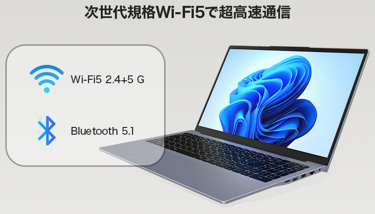デュアルバンドWi-Fi(2.4GHz/5GHz)とBluetooth接続に対応。高速で安定した通信を実現し、オンライン会議や動画視聴も途切れにくく快適です。