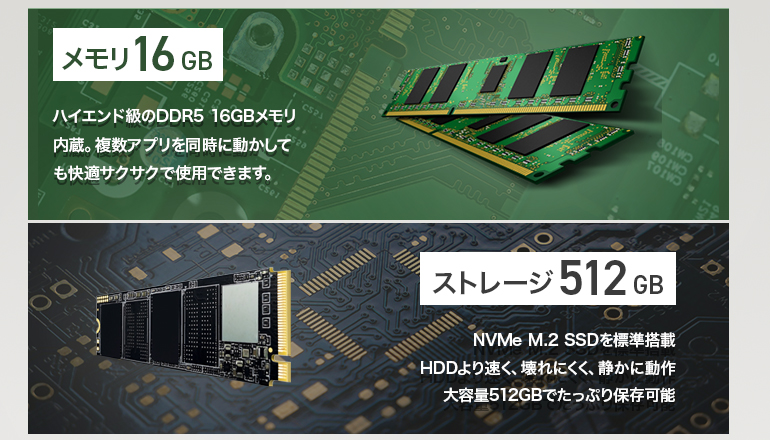 16GBメモリと512GB SSDの組み合わせにより、システム起動からアプリ操作までを高速化。