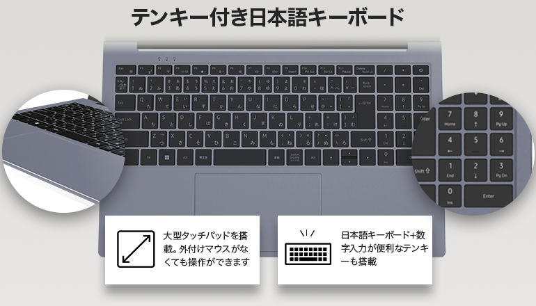 JIS規格の日本語配列キーボードを採用。日本国内で一般的に使用されている配置のため、初めての方でも違和感なく操作できます。